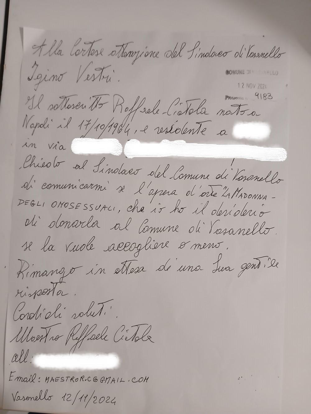 VASANELLO – (D.G.) Da oltre un anno, il Maestro Raffaele Ciotola, artista napoletano noto nel panorama dell’arte contemporanea italiana, attende una risposta dal Comune di Vasanello per una proposta che ha dell’incredibile: la donazione gratuita di una sua opera registrata presso l’Ufficio Italiano Brevetti e Marchi, già riconosciuta dal Ministero dello Sviluppo Economico, intitolata La Madonna degli Omosessuali.