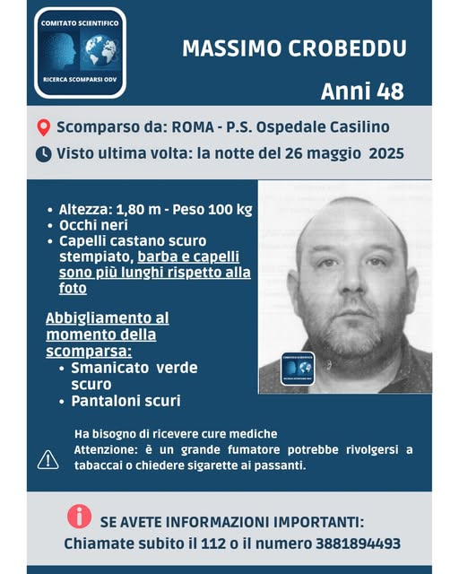 Roma, scompare due volte dal Pronto Soccorso, allarme per Massimo Crobeddu