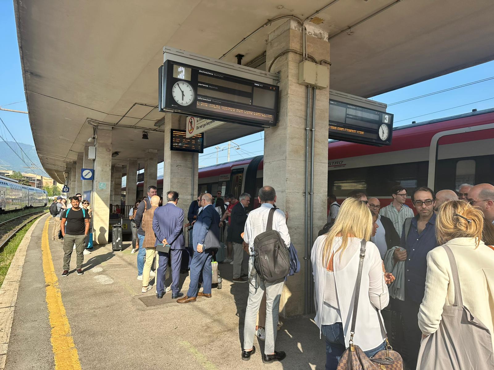 Questo il messaggio di Trenitalia inviato ai passeggeri: “La informiamo che, per un controllo tecnico al treno, il Frecciarossa 9625 da lei prenotato ha subìto una breve retrocessione, che comporterà un maggior termpo di viaggio complessivo di circa 180 minuti rispetto al programmato.Nella stazione di Cassino verrà effettuato un trasbordo sul treno Frecciarossa 9539, in partenza dal binario 2, che effettuerà le stesse fermate previste dal Suo treno.Nella stazione di Cassino è presente personale di Customer Care Trenitalia per assisterLa.