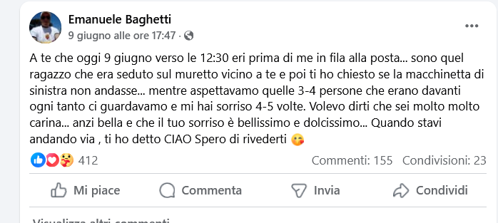 Su un gruppo di quartiere ha scritto: “A te che oggi 9 giugno verso le 12:30 eri prima di me in fila alla posta… sono quel ragazzo che era seduto sul muretto vicino a te e poi ti ho chiesto se la macchinetta di sinistra non andasse… mentre aspettavamo quelle 3-4 persone che erano davanti ogni tanto ci guardavamo e mi hai sorriso 4-5 volte. Volevo dirti che sei molto molto carina… anzi bella e che il tuo sorriso è bellissimo e dolcissimo… Quando stavi andando via , ti ho detto
