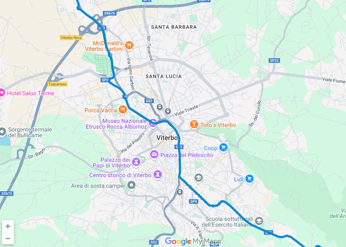 Nonostante questo, la Mille Miglia non potrà domani fare a meno di “circumnavigare” la città, percorrendo la cassia nord e attraversando Viale Raniero Capocci fino all’altezza di Porta Romana. Da lì il corteo storico devierà per Santa Maria in Gradi – come mostrano i cartelli già posizionati – e andrà verso Strada Cimina per raggiungere Ronciglione.