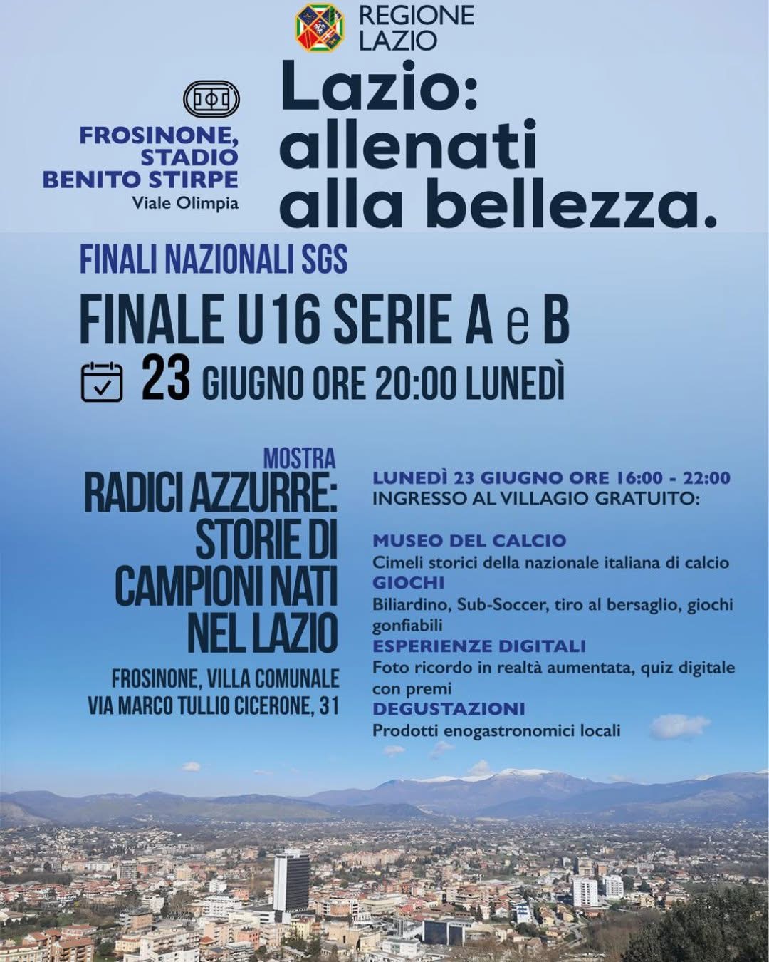 per maggiori info vai al linkhttps://www.figc.it/it/giovani/news/dal-23-al-30-giugno-un-villaggio-itinerante-promuover%C3%A0-le-eccellenze-del-lazio-durante-le-finali-giovanili