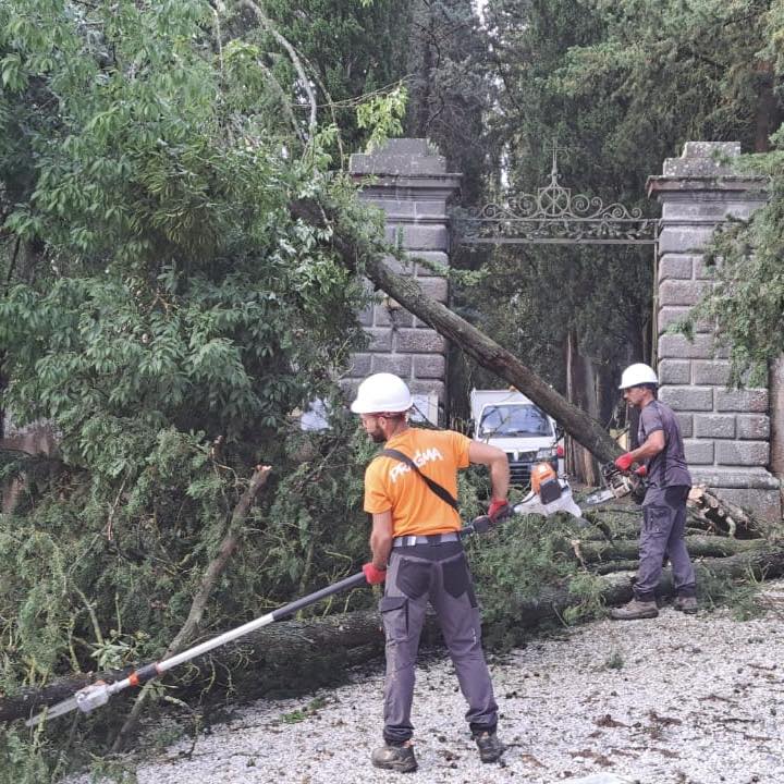 Il maltempo, concentrato in poco più di un’ora, ha causato la caduta di una pianta nel piazzale esterno del cimitero, ostruendo l’ingresso principale. All’interno, il vento ha danneggiato le coperture impermeabili di alcuni edifici-loculo, che sono crollate sulle tombe sottostanti. Allagato anche l’ufficio del custode, mentre sono in corso verifiche su altri alberi e piante per il rischio di ulteriori cedimenti.