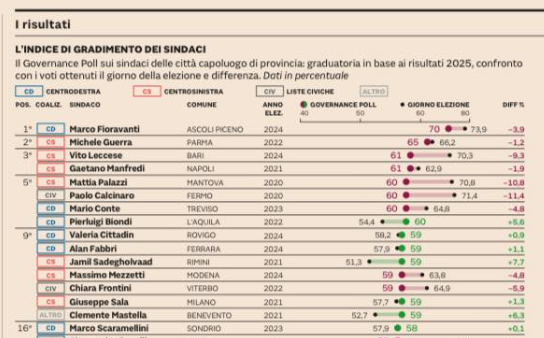 Ancora di più, se paragonata alla classifica del 2024, la sindaca risulta in grande ascesa. Lo scorso anno, infatti, l’indice di gradimento la posizionava addirittura in 34° posizione. Un passo da gigante, che la stessa prima cittadina ha voluto celebrare sui social con un post autocelebrativo.