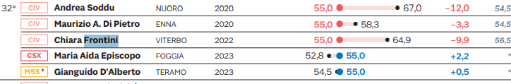 Nella classifica del Sol24 Chiara Frontini è anche al secondo posto assoluto dei sindaci provenienti da liste civiche, nel suo caso Viterbo2020, dietro solo a Paolo Calcinaro sindaco della città di Fermo.
