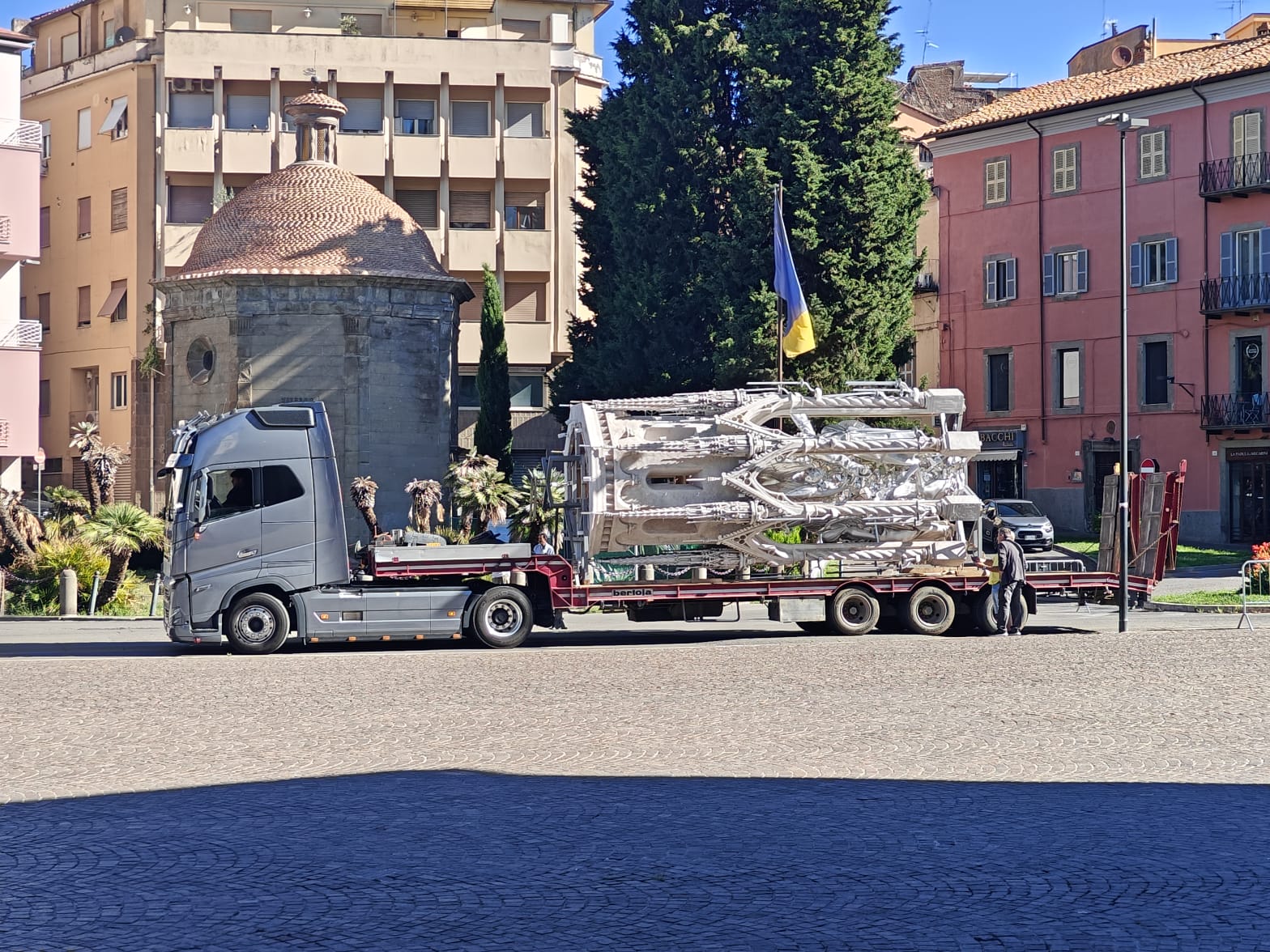 L’imponente struttura, simbolo della fede e dell’identità viterbese, è arrivata poco dopo l’alba, trasportata su camion scortati dalla polizia municipale lungo le strade del centro storico.