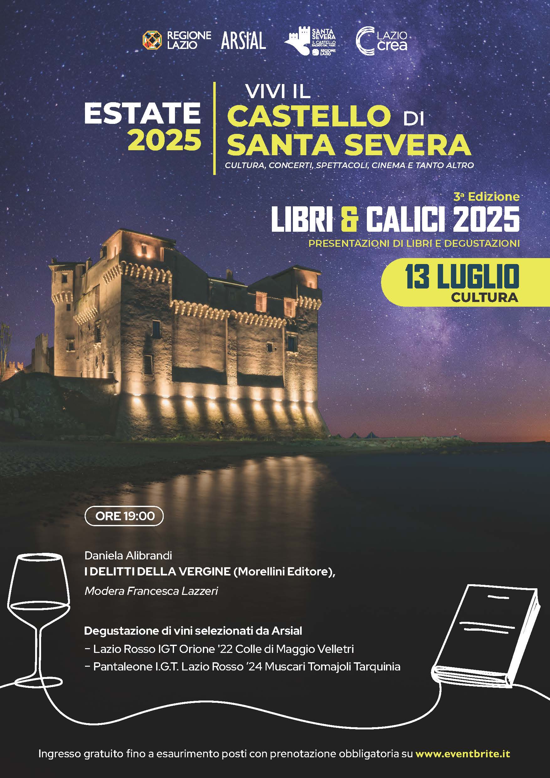 SANTA SEVERA (RM) – Il prossimo 13 luglio alle ore 19:00, nella suggestiva cornice del Castello di Santa Severa, torna uno degli appuntamenti più raffinati e attesi dell’estate culturale laziale: “Libri e Calici”, rassegna che fonde letteratura ed eccellenze enogastronomiche del territorio. Giunta alla sua terza edizione, l’iniziativa si distingue per il suo format immersivo e multisensoriale, che accompagna la presentazione di opere letterarie con la degustazione di vini laziali e prodotti tipici locali.