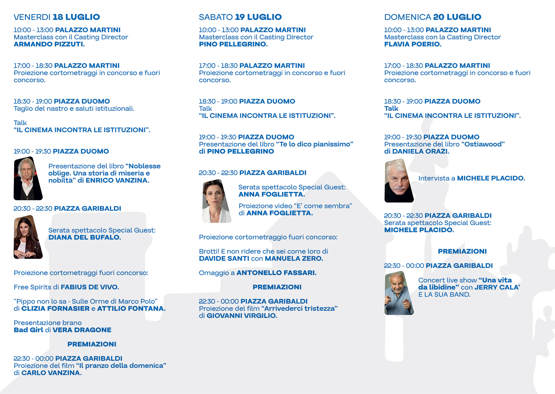 Ospiti nella giornata d’apertura Diana Del Bufalo e Enrico Vanzina (venerdì 18 luglio), oltre a Vera Dragone, Nina Pons, Federica Torchetti, Vince Vivenzio, Dea Lanzaro, Fabius De Vivo, Miriam Gagino, Clizia Fornasier, Attilio Fontana, Adelmo Togliani, Christian Filippi, il Presidente dell’Annaba Mediterranean Film Festival Mohamed Allal, il fondatore e direttore artistico del Festival E Io Ci Sto Fabrizio Oliverio e tanti altri.