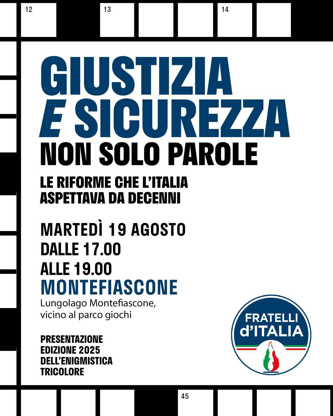 MONTEFIASCONE – Domani, martedì 19 agosto alle ore 17, il Circolo di Fratelli d’Italia di Montefiascone sarà presente sul lungolago con un gazebo informativo dedicato ai temi di giustizia e sicurezza.