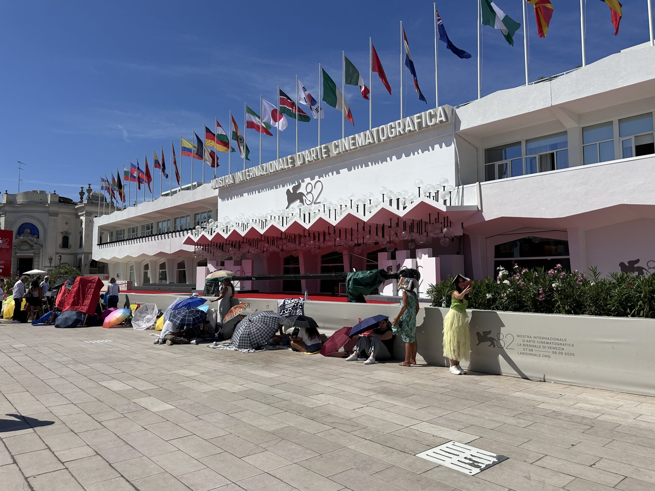 Alcune persone hanno dormito nel viale all’esterno dell’ingresso del Salone della mostra, e hanno atteso ore sotto il sole coperti da ombrelli prima di poter ammirare da vicino le star del cinema.