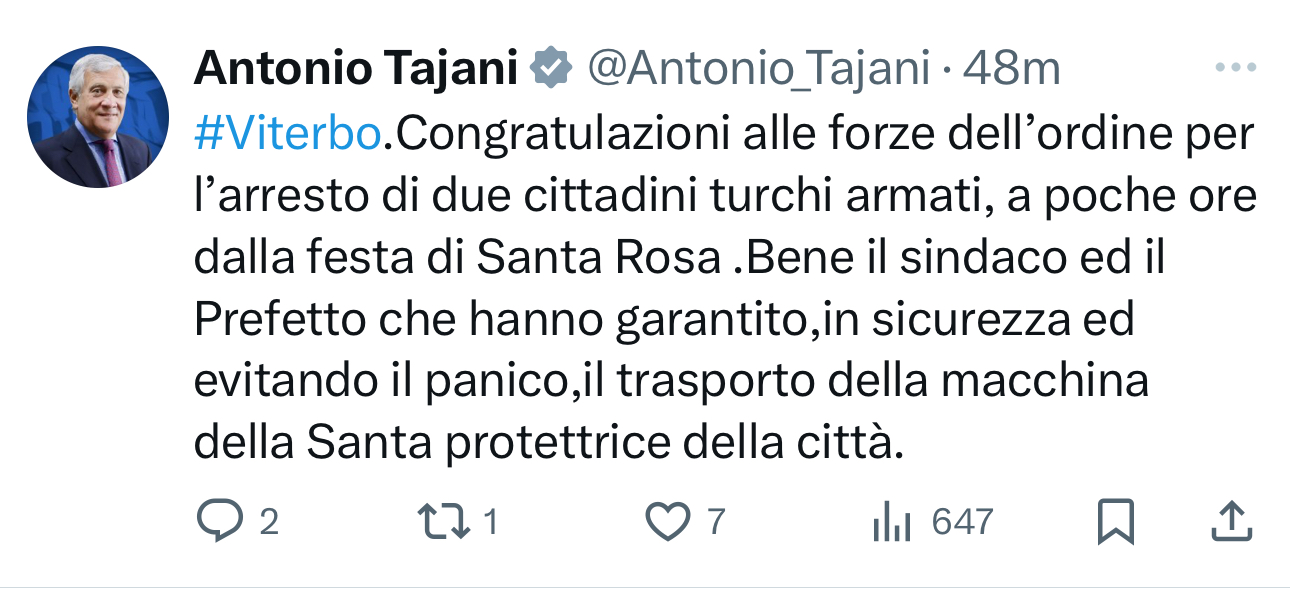Viterbo: Tajani si congratula per arresto di due turchi armati a poche ore da festa di Santa Rosa