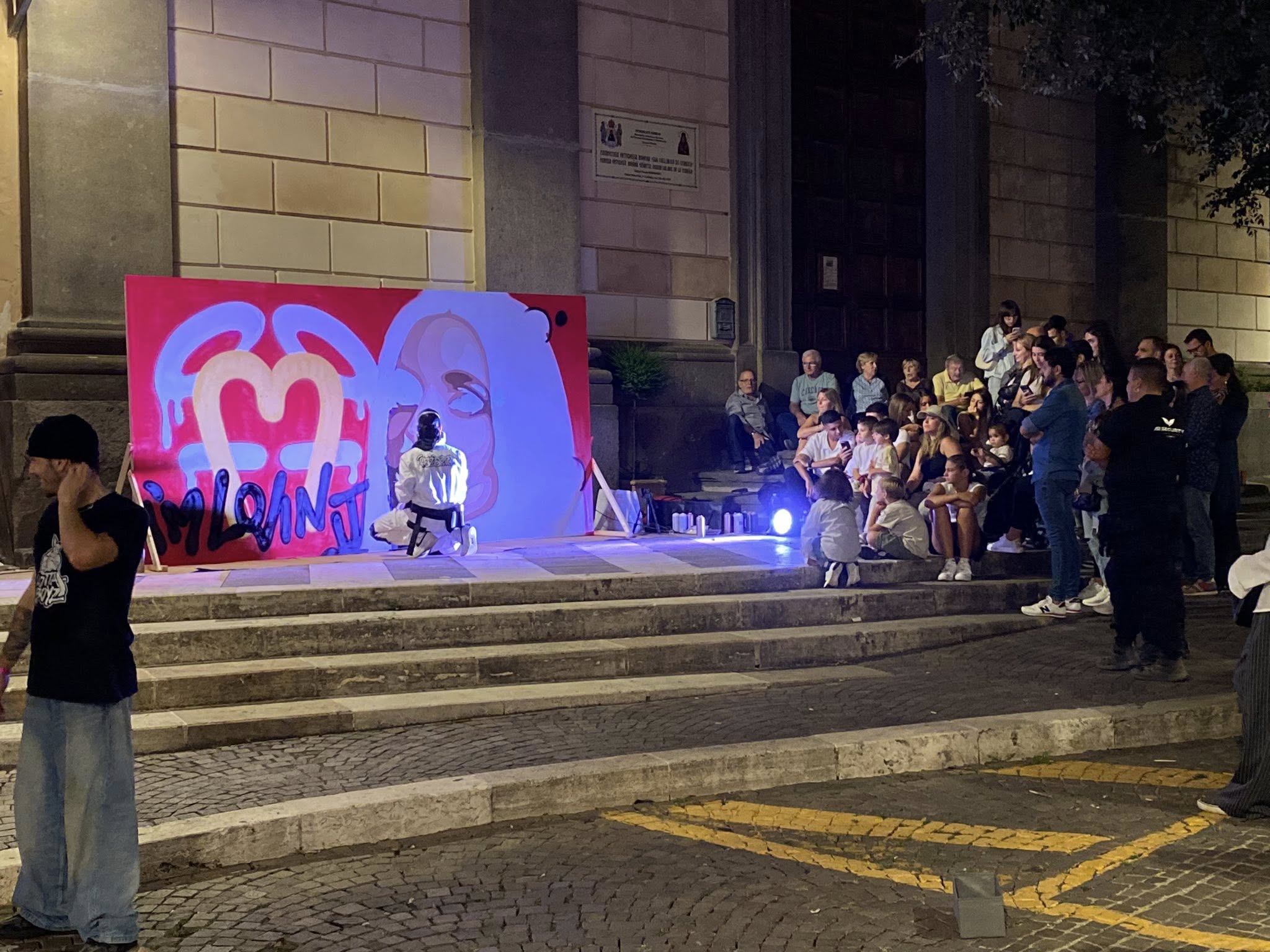 La freschezza di Faziarte, giovane ma già noto writer viterbese, ha invaso via Saffi con la sua spettacolare performance artistica di pittura, dove, contornato da ballerini di break dance, ha ritratto per la città il volto di Santa Rosa.