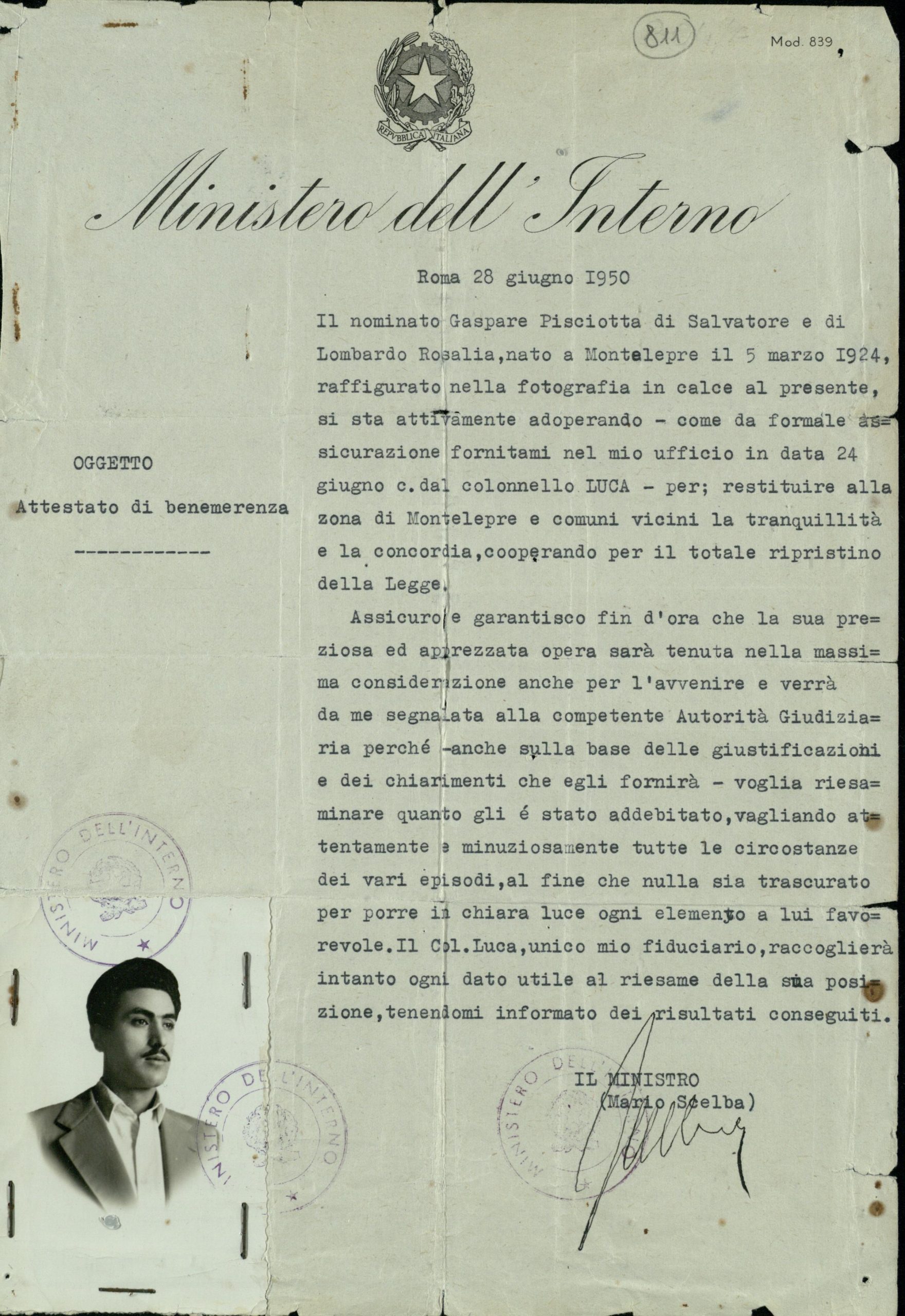 28 giugno 1950 – Attestato di benemerenza per Gaspare Pisciotta, per la sua collaborazione al ripristino della legalità nella zona di Montelepre (PA)