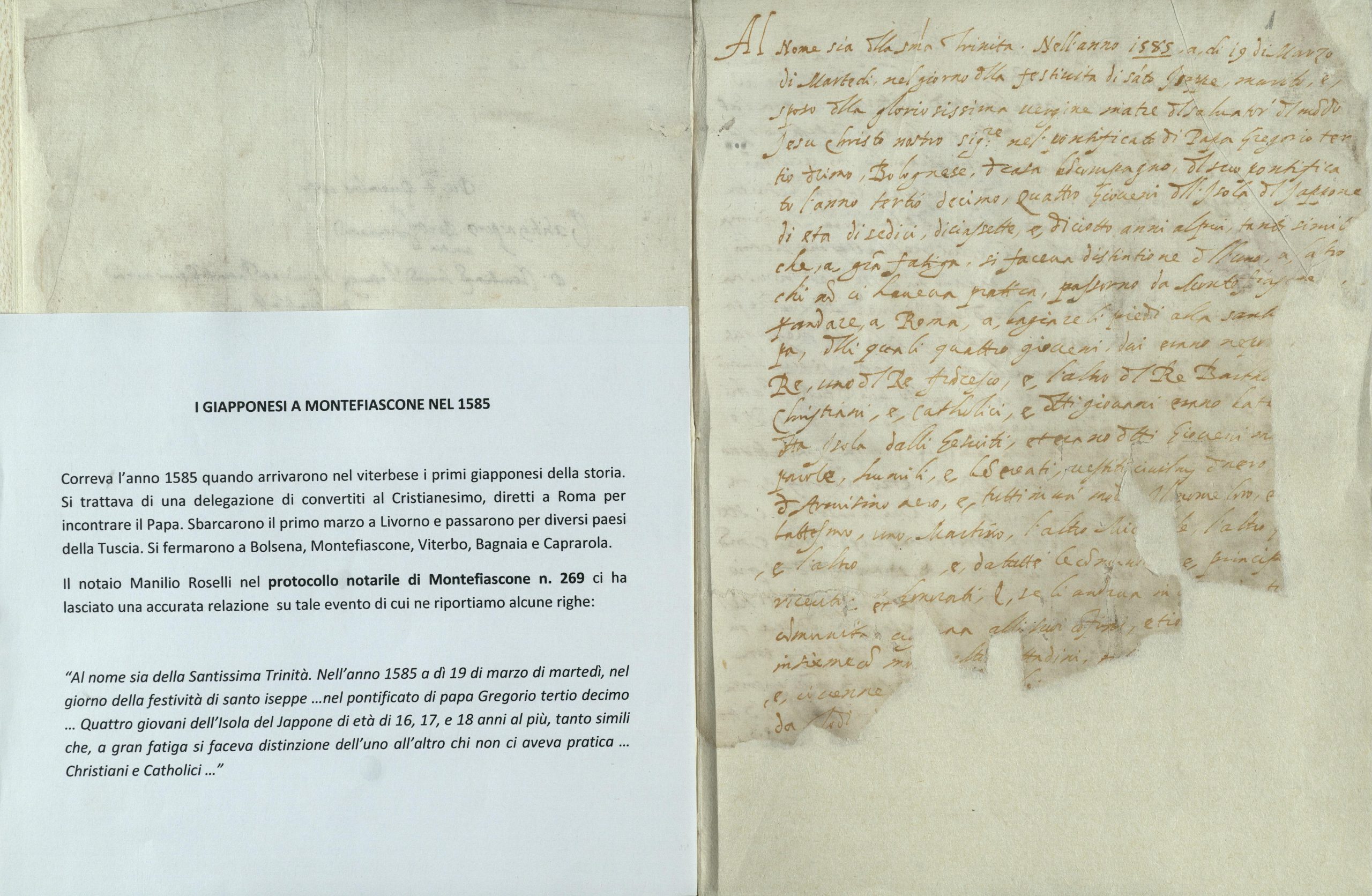 1585 – Relazione del notaio Man(i)lio Roselli sul passaggio nel viterbese di una delegazione di giapponesi convertiti al Cristianesimo. – Protocollo notarile di Montefiascone n. 269