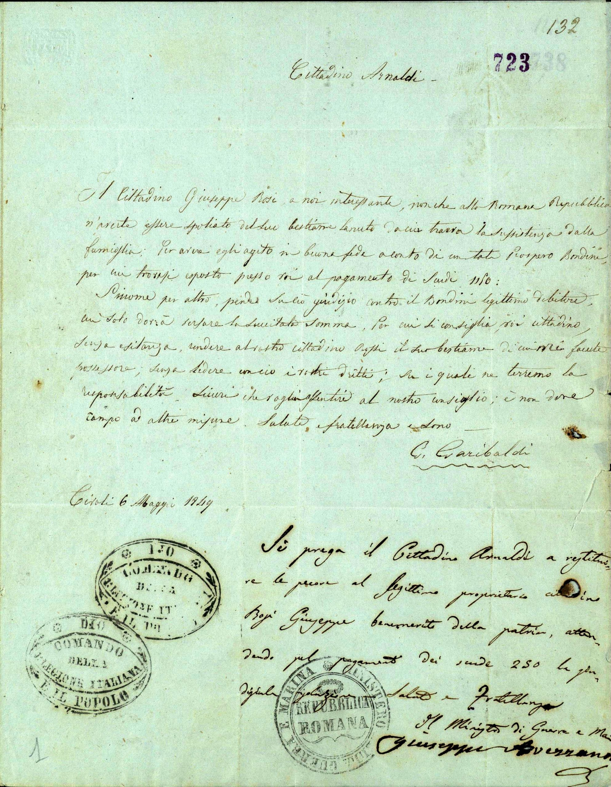 Lettera di “raccomandazione” chirografa di Giuseppe Garibaldi– 1849, maggio, 6. – Fondo Direzione Provinciale di Polizia. B. 44, c. 723