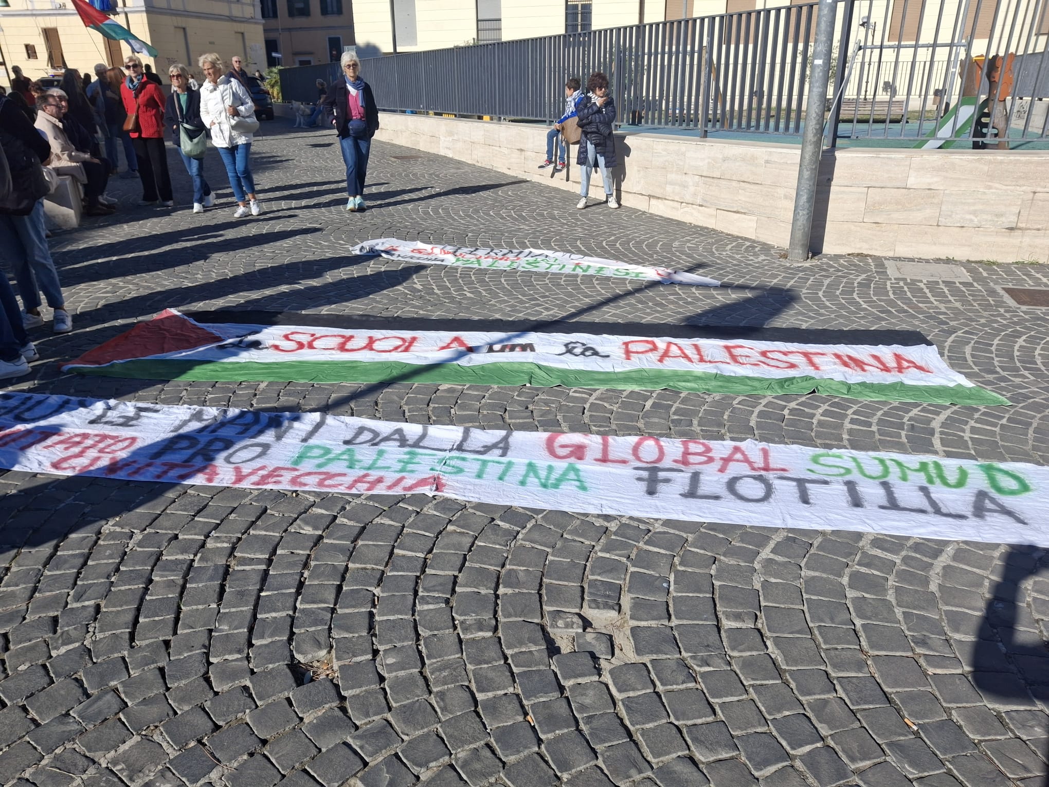 Un sabato, quello del 4 ottobre, organizzato dall’Amministrazione comunale di Civitavecchia che scende in campo con ANPI. Una giornata decollata già in mattinata con oltre trenta imbarcazioni al largo delle acque del porto per solidarietà nei confronti della Global Sumud Flotilla, spedizione internazionale organizzata per consegnare fabbisogni a Gaza stessa.