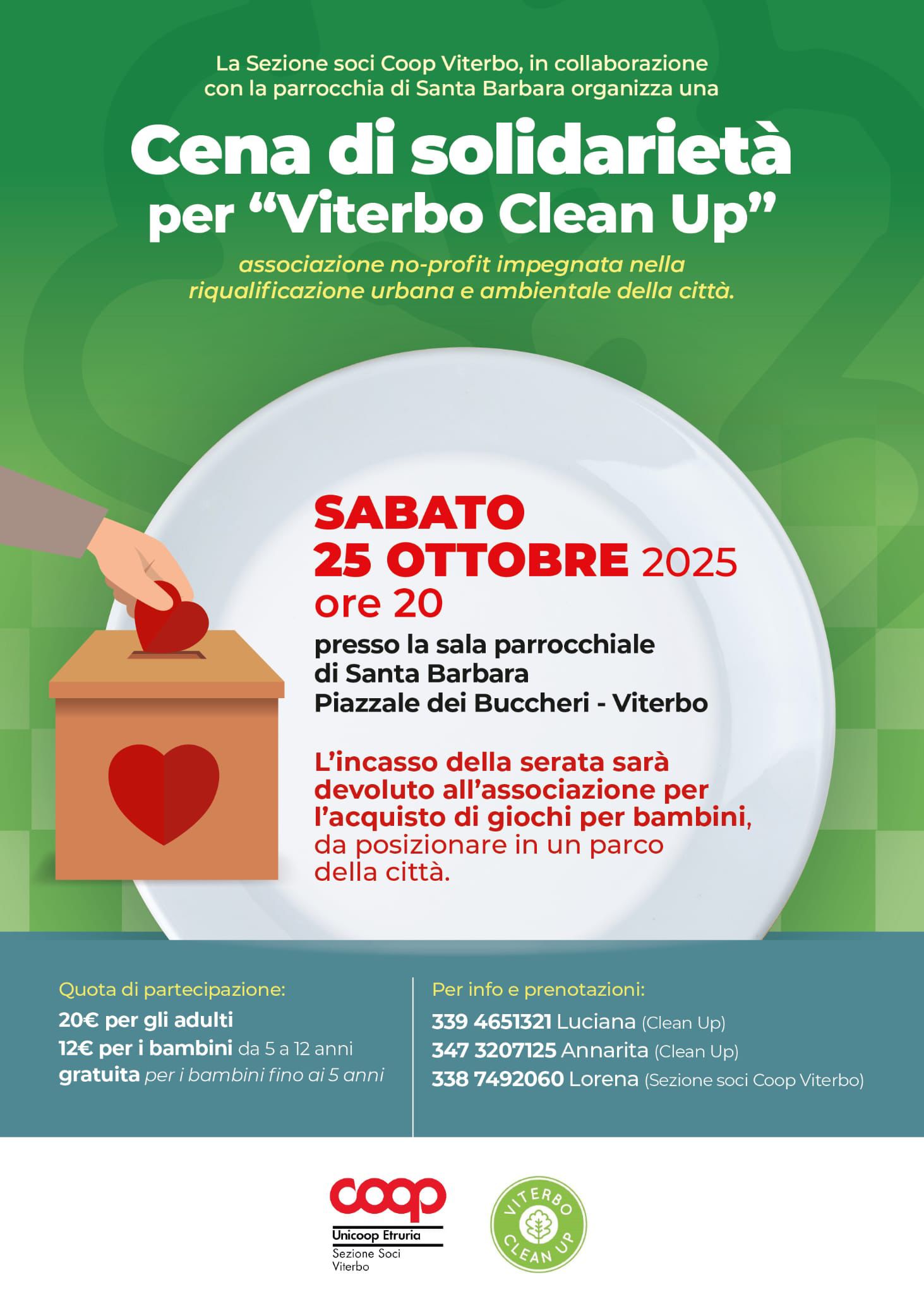 VITERBO – Dopo settimane di grande partecipazione alla raccolta fondi “Il gioco dei bambini”, l’associazione Viterbo Clean Up si prepara all’appuntamento conclusivo: la cena di solidarietà che si terrà sabato 25 ottobre alle ore 20 presso la sala parrocchiale di Santa Barbara, in piazzale dei Buccheri.