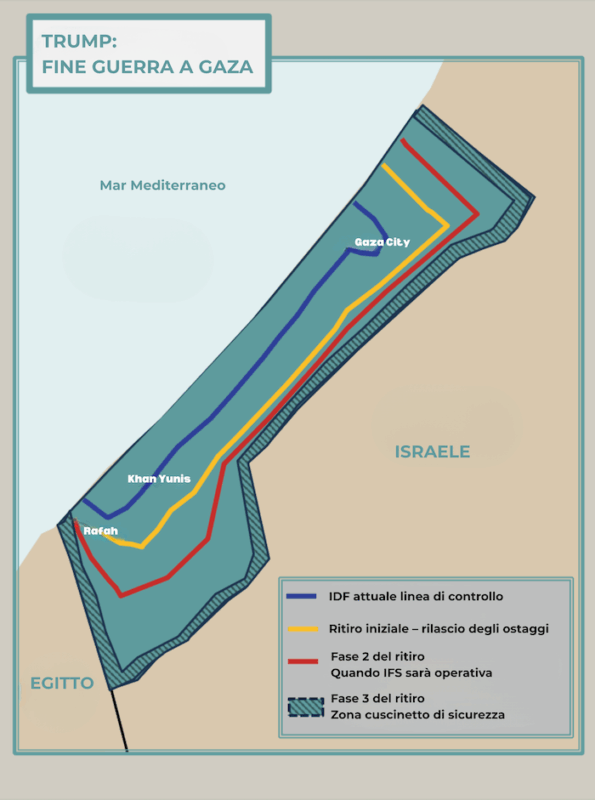 3. Se entrambe le parti accettano questa proposta, la guerra terminerà immediatamente. Le forze israeliane si ritireranno fino alla linea concordata [vedi mappa] per prepararsi alla liberazione degli ostaggi. Durante questo periodo tutte le operazioni militari, comprese quelle aeree e di artiglieria, saranno sospese, e le linee del fronte resteranno congelate finché non saranno soddisfatte le condizioni per il completo ritiro scaglionato.
