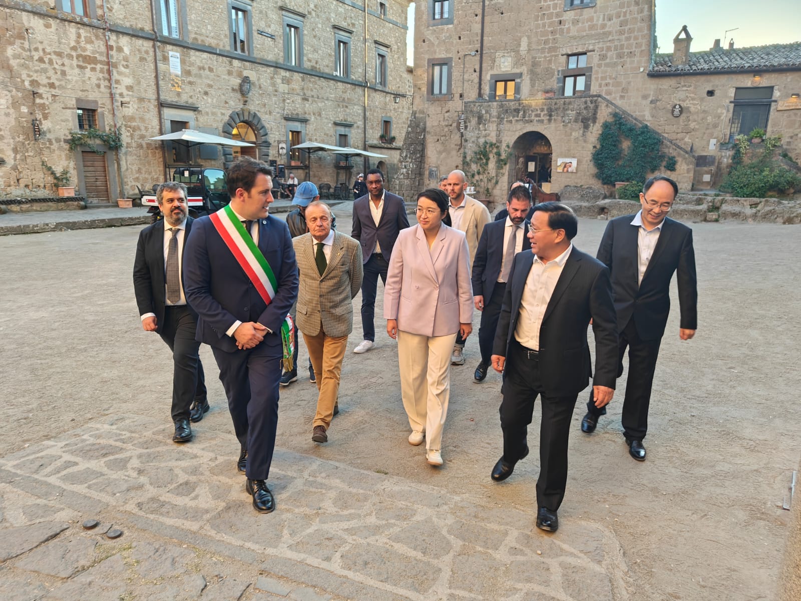 BAGNOREGIO – Ieri pomeriggio Civita di Bagnoregio ha accolto una visita inaspettata e di grande rilievo internazionale: Han Jun, Ministro dell’Agricoltura e degli Affari Rurali della Repubblica Popolare Cinese, ha scelto di trascorrere parte della sua breve permanenza in Italia — appena 48 ore — nella celebre “Città che muore”. Il ministro si trova nel nostro Paese per partecipare alle celebrazioni dell’80º anniversario della FAO, in programma tra ieri e oggi a Roma, ma non ha voluto rinunciare a conoscere da vicino uno dei luoghi simbolo dell’Italia rurale, di cui aveva sentito parlare a lungo dallo staff e dall’ambasciatore cinese in Italia.
