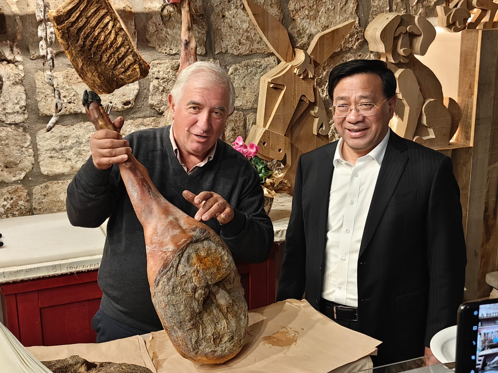 La visita è stata anche un’occasione per scoprire e degustare i prodotti tipici locali presso Le Botteghe di Leone, una delle attività storiche del borgo. Il titolare, Settimio Crocoli, ha raccontato al ministro la tradizione dei salumi e delle produzioni artigianali e la lunga storia dell’azienda, suscitando grande curiosità. Han Jun ha chiesto informazioni sui processi produttivi, sui costi e sui mercati di riferimento, mostrando interesse concreto per il modello agricolo locale e un’elevata esperienza nel settore di sua competenza. Non è mancato un tocco di leggerezza: il ministro ha infatti acquistato la celebre “Acqua di Civita”, il profumo artigianale ispirato al borgo, simbolo della sua unicità e del legame con la natura.