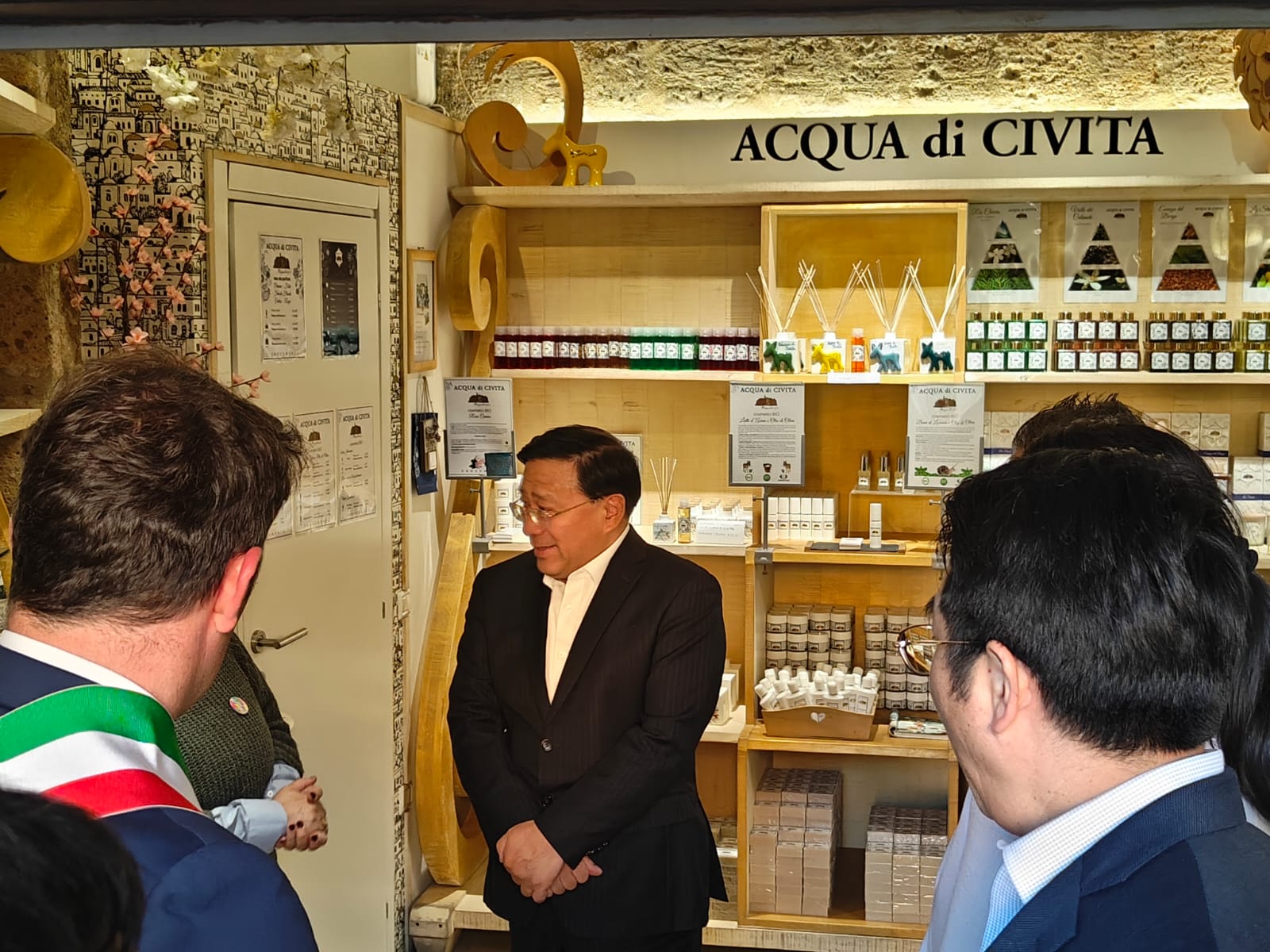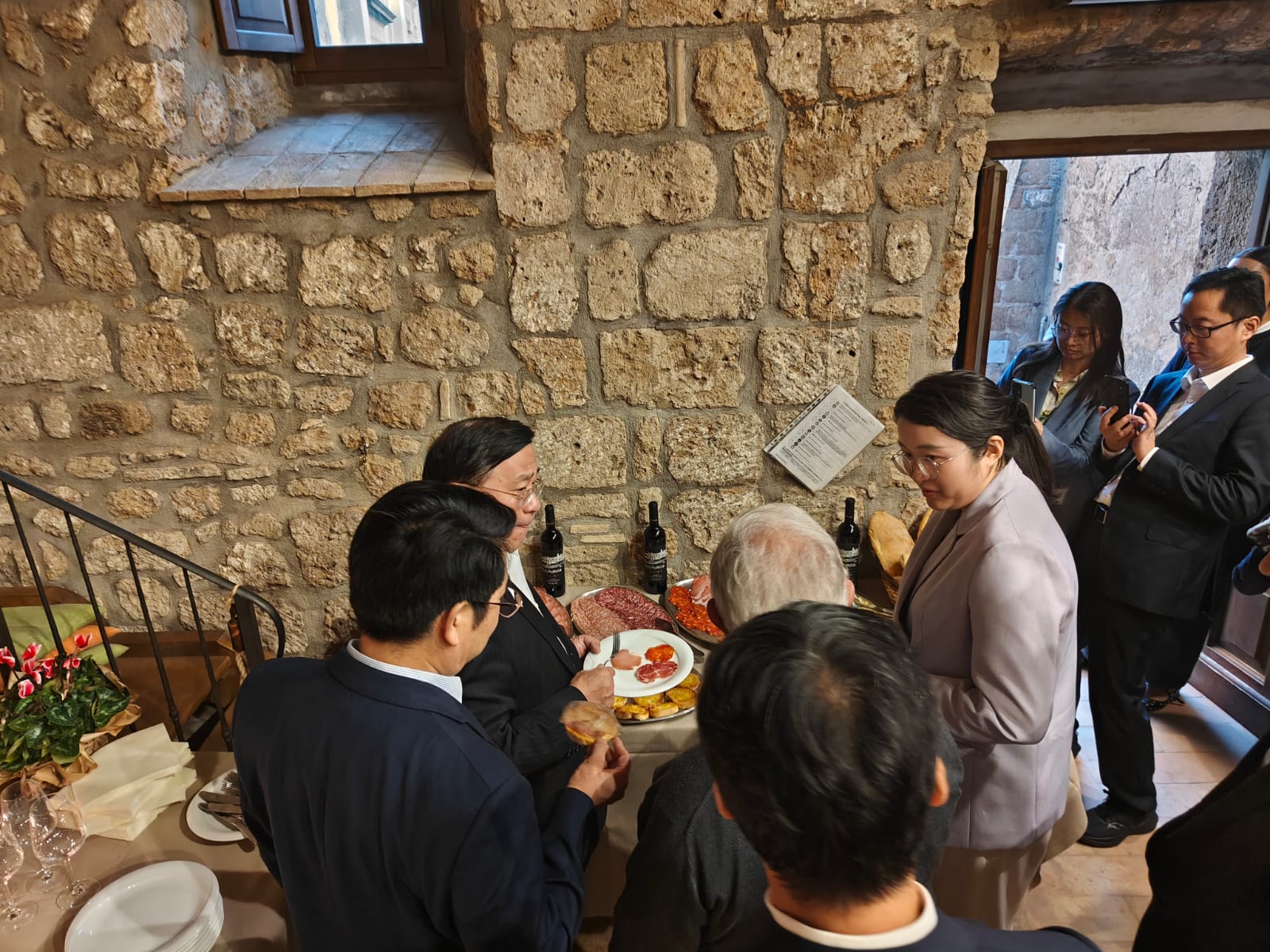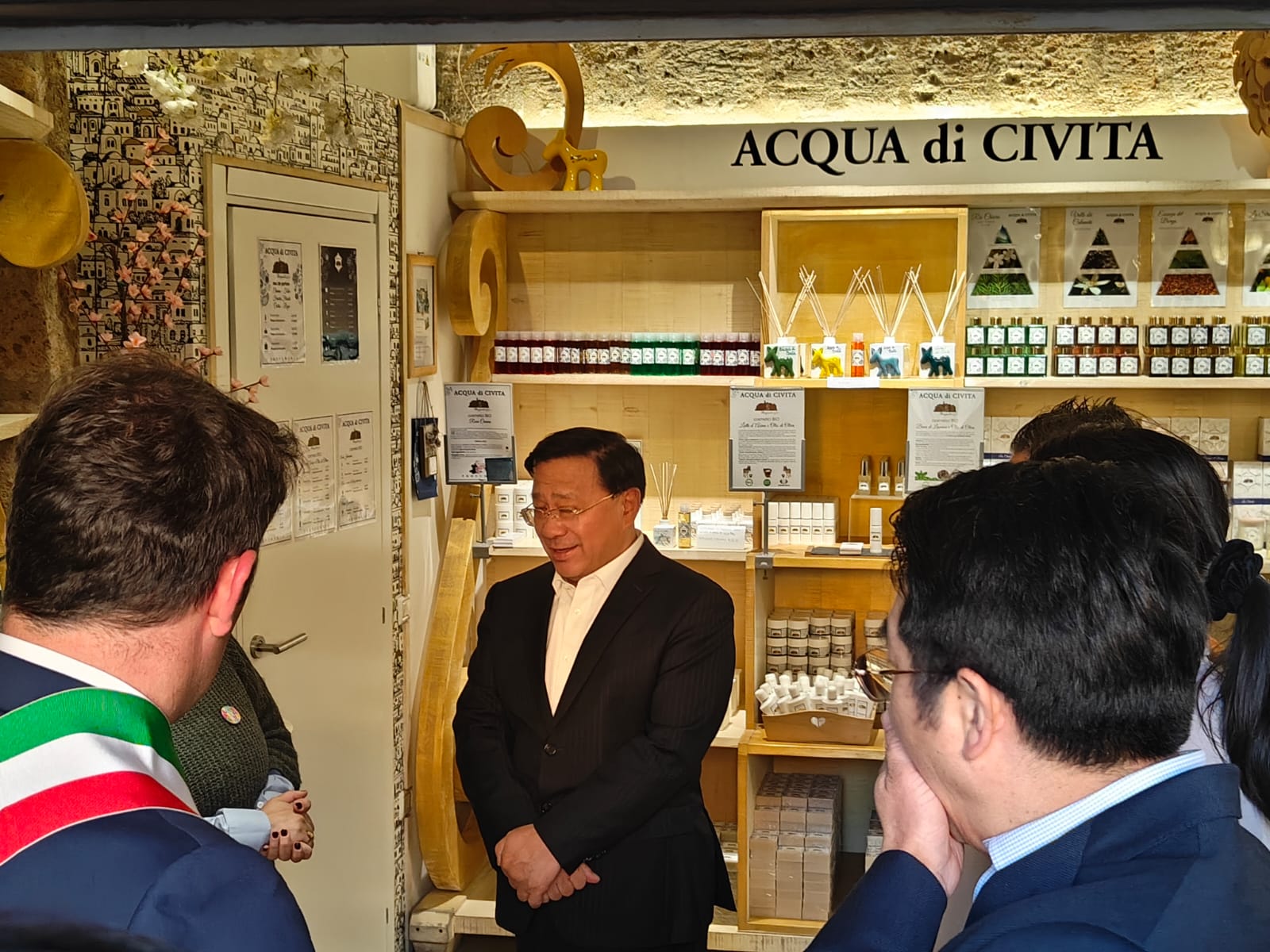 La visita è stata anche un’occasione per scoprire e degustare i prodotti tipici locali presso Le Botteghe di Leone, una delle attività storiche del borgo. Il titolare, Settimio Crocoli, ha raccontato al ministro la tradizione dei salumi e delle produzioni artigianali e la lunga storia dell’azienda, suscitando grande curiosità. Han Jun ha chiesto informazioni sui processi produttivi, sui costi e sui mercati di riferimento, mostrando interesse concreto per il modello agricolo locale e un’elevata esperienza nel settore di sua competenza. Non è mancato un tocco di leggerezza: il ministro ha infatti acquistato la celebre “Acqua di Civita”, il profumo artigianale ispirato al borgo, simbolo della sua unicità e del legame con la natura.