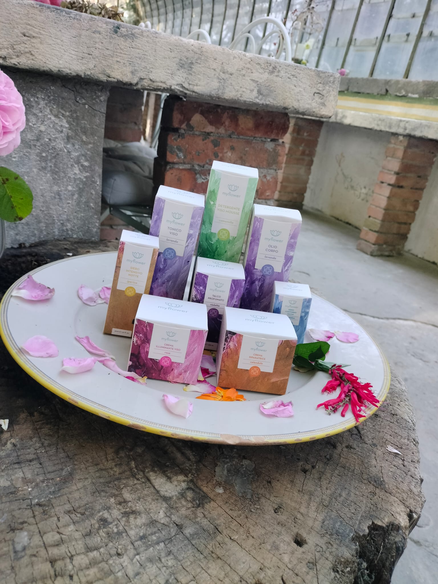 MYFLOWER è una linea cosmetica naturale originale e autentica, costituita da prodotti biologici, 100% naturali. Ogni contenitore, ogni flacone è un mosto ricco di attivi energizzati sourced a Villa Lina, che racchiude la forza dell’antica semplicità, che nulla toglie e nulla aggiunge al potere della Natura. Nella formulazione di bellezza adotta il waterless ed ha quasi totalmente prodotti eduli: Rosa, Calendula, Lavanda, Fiordaliso, Iperico, Violetta e Camomilla, danno vita a siero, talco e creme riparatrici, in un packaging d’autore, curato dall’artista Alessandro Twombly.