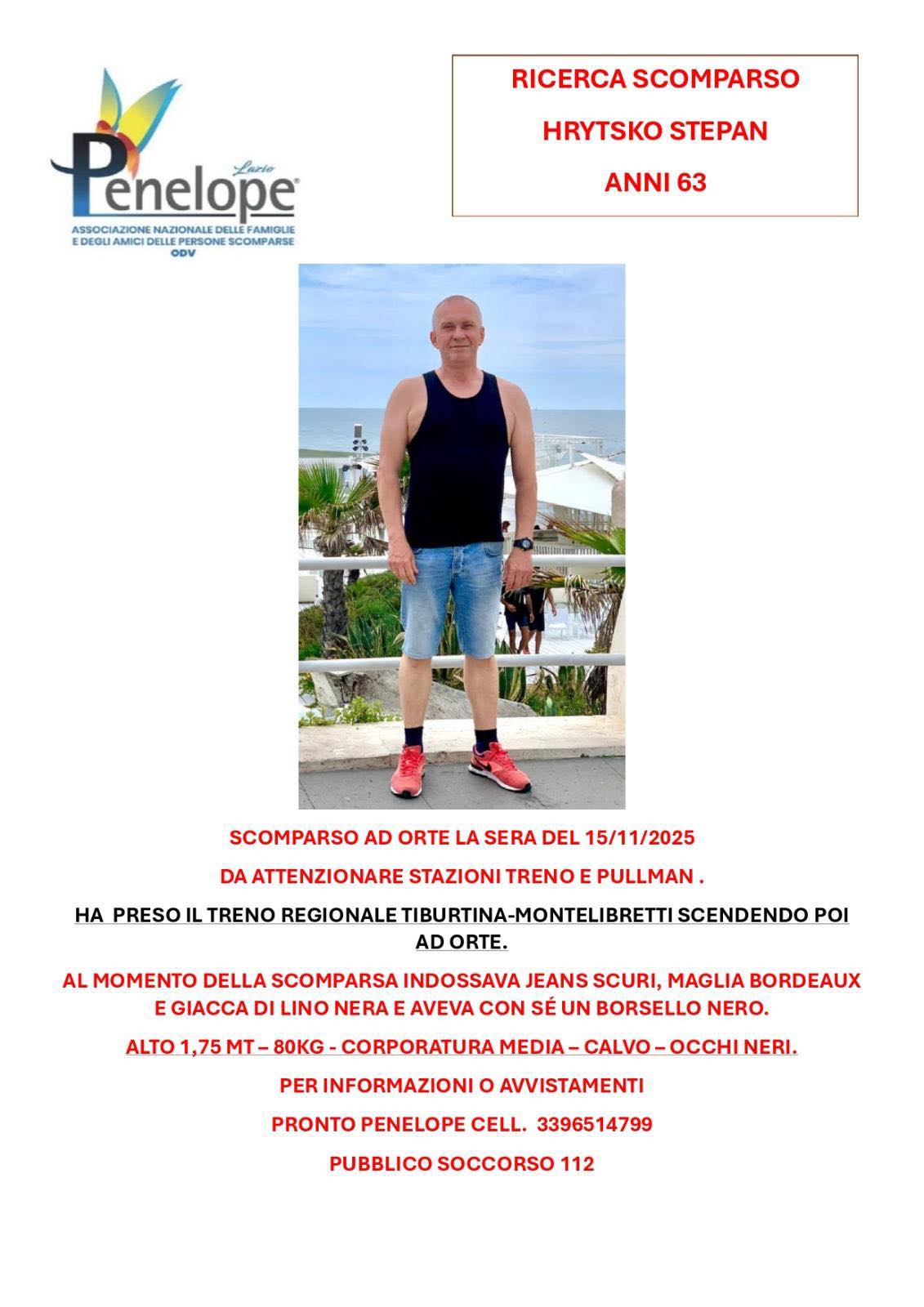ORTE – Sono in corso le ricerche di Hrytsko Stepan, 63 anni, scomparso la sera del 15 novembre 2025 dopo essere arrivato alla stazione ferroviaria di Orte. A diffondere l’appello è l’associazione Penelope Lazio ODV, che invita chiunque abbia informazioni a contattare immediatamente i numeri dedicati.