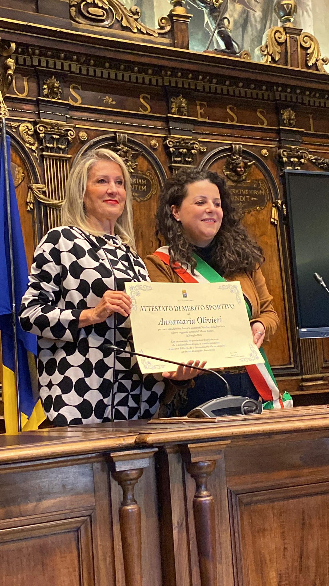 VITERBO – Importante riconoscimento per la viterbese Annamaria Olivieri che ieri ha ricevuto, dalla sindaca Chiara Frontini, l’attestato di merito sportivo.
