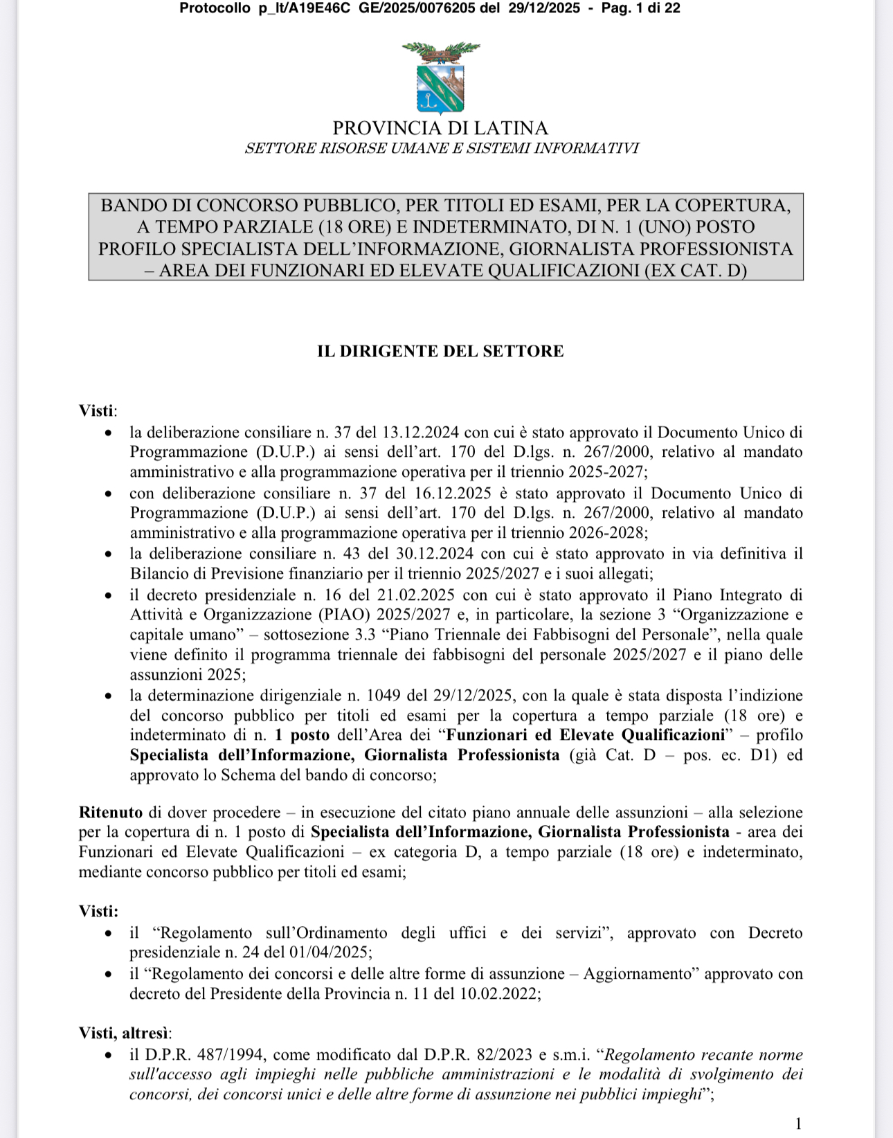 LATINA – ”Il bando di concorso pubblico indetto dalla Provincia di Latina per la copertura di un posto a tempo parziale e indeterminato di “Specialista dell’Informazione – Giornalista Professionista” solleva, ancora una volta, una questione grave e non più rinviabile: l’esclusione dei giornalisti pubblicisti dai concorsi pubblici, nonostante essi svolgano, per legge e per prassi consolidata, le medesime funzioni dei giornalisti professionisti.