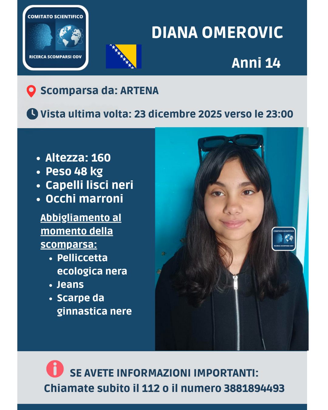 ROMA – Cresce l’apprensione ad Artena per la scomparsa di Diana Omerovic, 14 anni, di cui non si hanno più notizie dalla serata del 23 dicembre 2025.