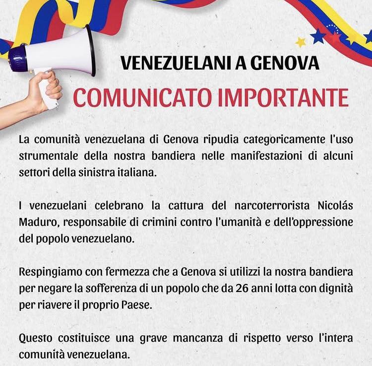 Un gesto che, inevitabilmente, ha avuto il suo strascico di conseguenze e contro il quale si schiera la comunità venezuelana di Genova, protestando contro l’uso della loro bandiera in manifestazioni strumentali.