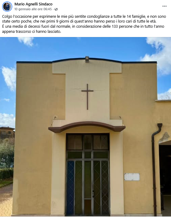 “Colgo l’occasione per esprimere le mie più sentite condoglianze a tutte le 14 famiglie, e non sono state certo poche, che nei primi 9 giorni di quest’anno hanno perso i loro cari di tutte le età. É una media di decessi fuori dal normale, in considerazione delle 133 persone che in tutto l’anno appena trascorso ci hanno lasciato.”
