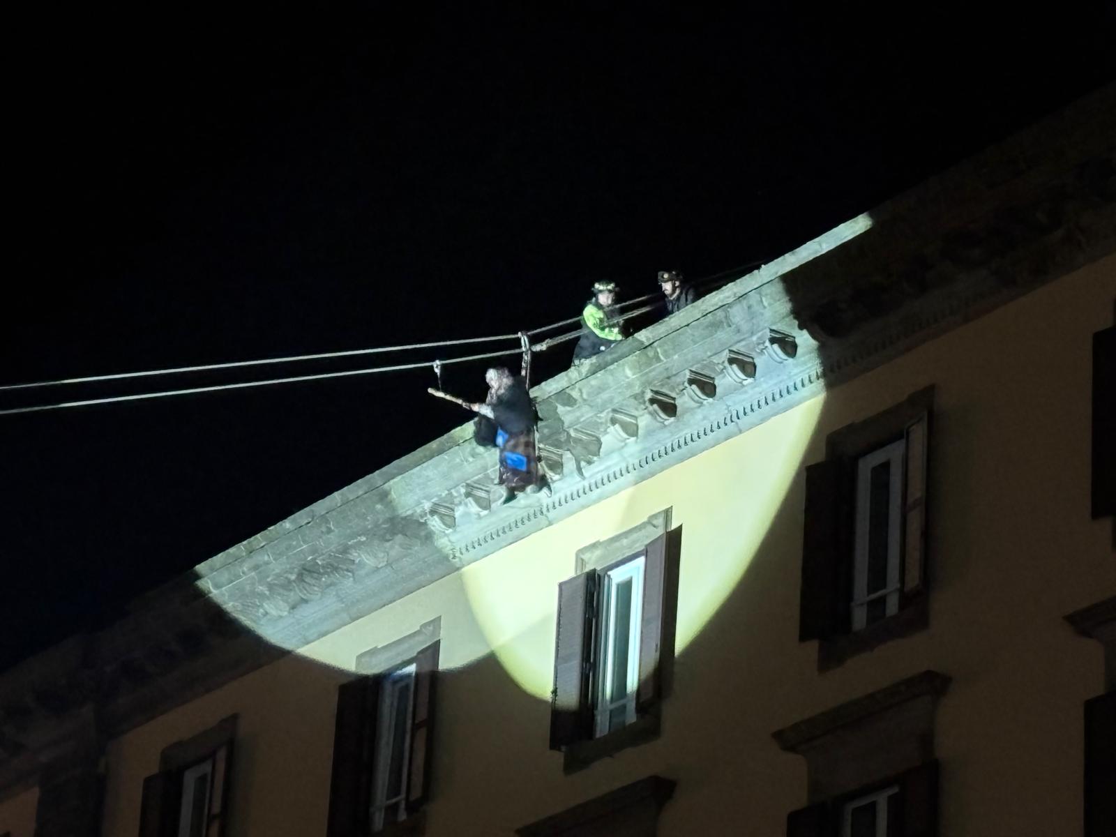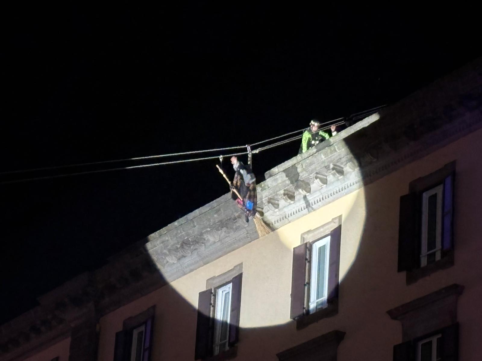Per il secondo anno di fila, la manifestazione si è svolta lontano dalla tradizionale sede di piazza del Comune, trovando spazio in piazza della Rocca. Il momento più atteso è arrivato nel tardo pomeriggio, intorno alle 18, quando un vigile del fuoco si è calato dall’alto con una manovra su corda, interpretando la celebre “vecchina” e regalando uno spettacolo suggestivo al pubblico presente.