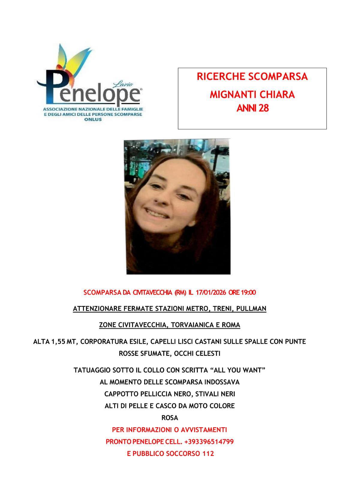 L’Associazione Penelope invita chiunque abbia visto la ragazza o sia in possesso di informazioni utili a contattare immediatamente il numero Pronto Penelope 393 9651479 oppure il 112.
