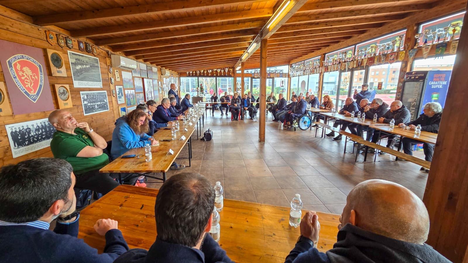 Un club da sempre attento e legato al territorio, per l’appunto. Fortemente radicato alle sue origini, ai suoi valori, alla sua comunità. E quindi un supporto soprattutto al movimento regionale e capitolino. Con questo presupposto, settimana scorsa andava in scena il primo meeting di Tavola Ovale, un progetto di confronti per illustrare e dialogare sull’evoluzione e lo sviluppo del rugby nel tessuto sociale ed economico come modello di sport sostenibile. Un progetto che ha raccolto l’adesione di istituzioni, figure e personalità importanti, così come di oltre 30 società del territorio: “La missione della Tavola Ovale è quella di restituire centralità al Lazio. Una regione tra le prime tre a livello di importanza per numero di tesserati e club d’Italia. Le Fiamme Oro rappresentano il vertice del movimento rugbistico regionale, perché siamo gli unici a partecipare alla massima serie. Quindi siamo noi che ci siamo sentiti in dovere di portar avanti questo discorso con tutte le altre società laziali. Il nostro ruolo è chiaramente anche istituzionale, e abbiamo voluto letteralmente realizzare una tavola ovale in cui potessero partecipare personalità rilevanti con precedenti sportivi altrettanto prestigiosi: per questo presente figure come quelle del Prefetto Armando Forgione, Direttore centrale del personale, l’artefice di quello che oggi è il progetto della Fiamme Oro Rugby, perché il campo di Ponte Galeria fu una sua intuizione e divenne protagonista dell’ascesa del club degli anni Duemila. Sebben non rivesta alcuna carica all’interno delle Fiamme, resta una figura storicamente importantissima per il nostro movimento, è il nostro primo tifoso. Io e lui abbiamo un rapporto simil a quello tra Boniperti e Agnelli, questo è il livello dei dialoghi che da sempre abbiamo. Ha partecipato anche il gotha del rugby romano, Gregorio Rebecchini, il presidente della Capitolina, una storia importantissima, un club dal forte profilo identitario, perché il loro campo fu confiscato alla Banda della Magliana. Con lui il Presidente della Lazio, ex giocatore ed oggi avvocato di lustro, Alfredo Biagini. Fortissimo il legame tra lo sport, i suoi valori e le istituzioni. Quindi anche naturalmente Svevo Valentinis, presidente della Rugby Roma, così come Mauro Nori, ex giocatore della Nazionale ed esperienze con Lazio e Firenze, oggi Capo di Gabinetto del Ministero del Lavoro e delle Politiche Sociali. Ad arricchire una platea del genere anche naturalmente Cristina Tonna, responsabile del rugby femminile, così come Maurizio Amadei in qualità di rappresentante della Federazione e presidente del Lazio. Abbiamo affrontato diversi argomenti determinanti, i primi nell’agenda dei club: la formazione dei dirigenti, la possibilità di far gruppi misti per avviare anche la parte del rugby femminile che nutre un suo valore ed una sua ricchezza perché consentirebbe ai club di avere introiti interni superiori; abbiamo discusso di come poter costruire l’identità di un club, attraverso una club house, dove c’è ristorante, attraverso questo tipo di imprenditoria i club possono crescere sotto ogni aspetto; abbiamo discusso dell’evoluzione di un club come la Lazio, come la Rugby Roma, club dalla storia importante. Abbiamo trattato modelli di gestione che contemplano da una parte degli impegni sociali, dall’altra iniziative economiche che servono per autofinanziarsi. Quindi non volevamo offrire semplicemente una rassegna teorica, ma proprio esempi concreti con cui dimostrar che si possa fare rugby sostenibile. Indicare una strada. In questo momento le Fiamme rappresentano l’apice del sogno per i ragazzi del centrosud, noi abbiamo messo sul piatto la possibilità d’esser d’aiuto per tutti i club: essendo un ente sportivo pubblico, cerchiamo di mettere a disposizione di tutti gli altri club i nostri tecnici, così come le nostre strutture. A fine febbraio ci sarà un altro meeting, per capir chi vorrà aderire alle nostre idee”.