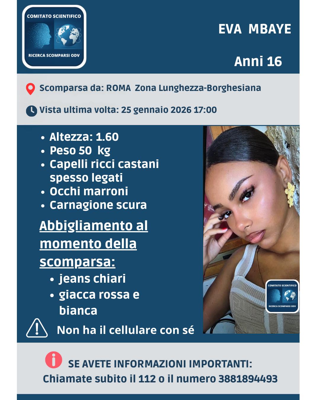 Eva Mbaye si è allontanata dalla sua casa familiare di Roma Zona Lunghezza/Borghesiana lo scorso 25 gennaio: da quel giorno non ha più fatto rientro nell’abitazione e non è entrata a scuola.