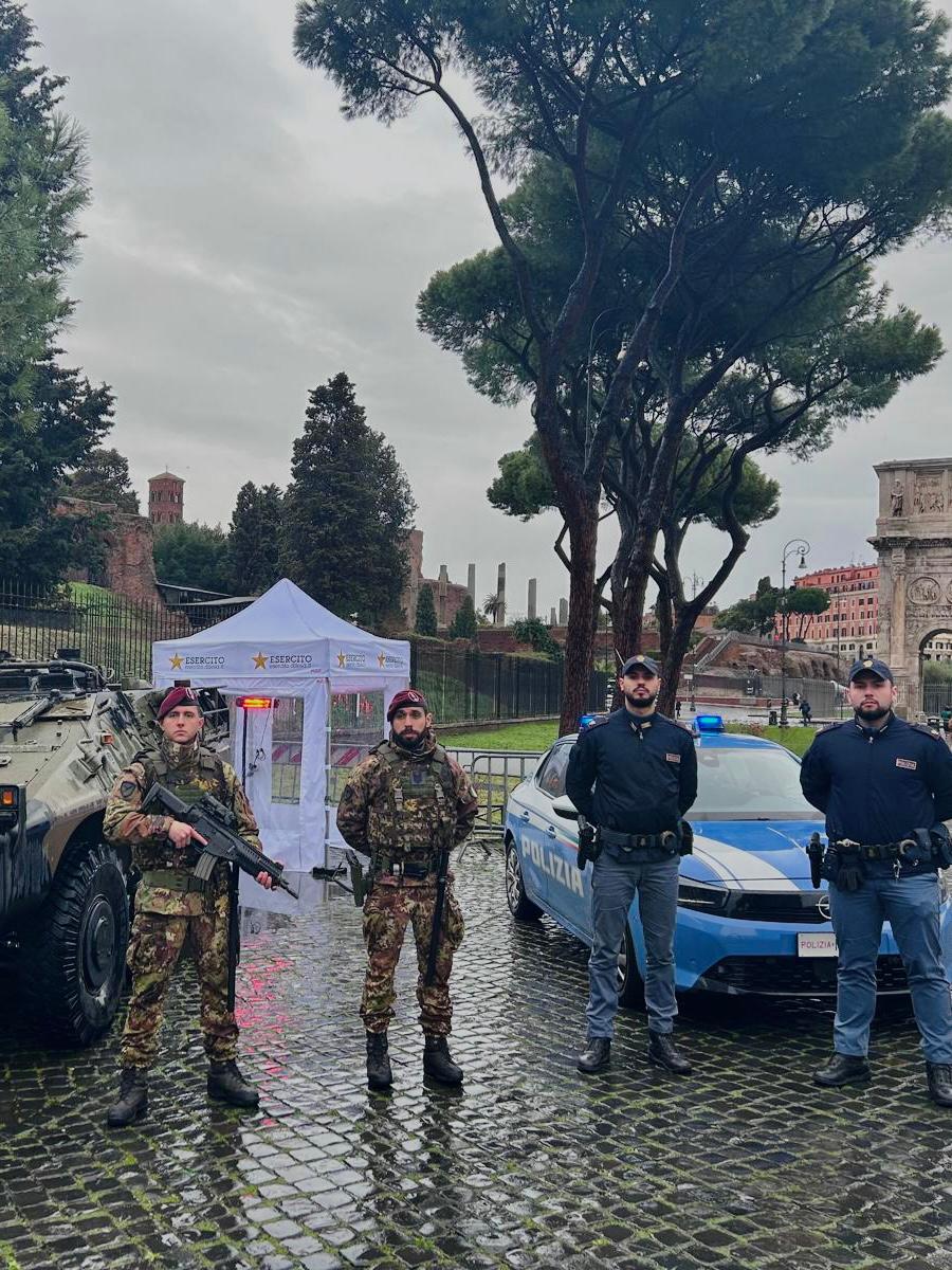 Ai due veicoli blindati schierati nella zona della stazione Termini si aggiunge un terzo veicolo che è stato dislocato nei pressi del Colosseo, in corrispondenza dell’Arco di Costantino, sempre ad implementazione del presidio già in atto a cura dei militari dell’Esercito Italiano nella cornice dell’operazione Strade Sicure.