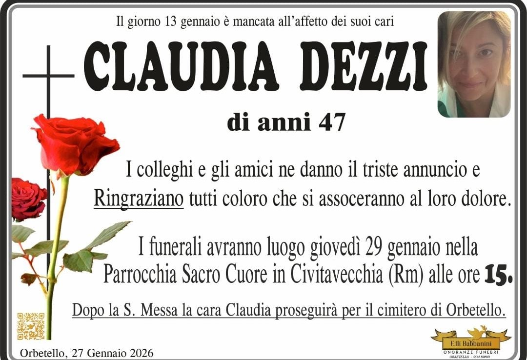 CIVITAVECCHIA – Si terranno oggi i funerali della dottoressa Claudia Dezzi, trovata senza vita nella sua abitazione di Orbetello il 13 gennaio. La donna, romana, era medico in servizio alla ASL Roma 4 e lavorava da alcuni anni tra il pronto soccorso dell’ospedale San Paolo di Civitavecchia e il reparto di ortopedia,