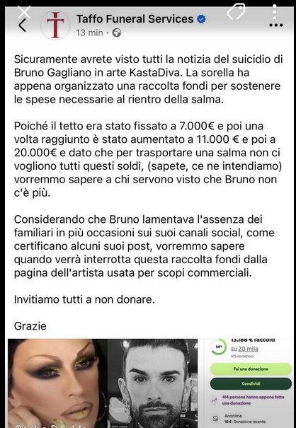 Tra i primi a denunciare la scarsa trasparenza della campagna, la nota agenzia funebre Taffo che, sui suoi canali denuncia: “Poiché il tetto era stato fissato a 7mila euro e poi una volta raggiunto è stato aumentato a 11mila euro e poi a 20mila euro e dato che per trasportare una salma non ci vogliono tutti questi soldi, (sapete, ce ne intendiamo) vorremmo sapere a chi servono visto che Bruno non c’è più”.