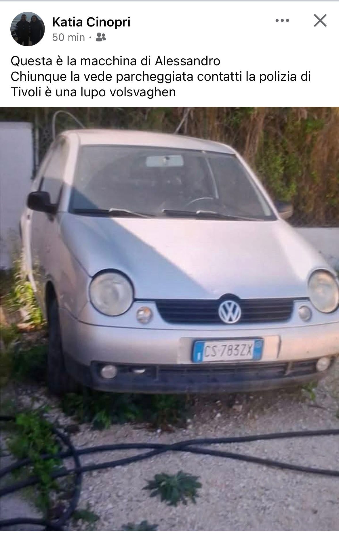 Si teme che la vettura possa essere la Wolkswagen Lupo di Alessandro Giannetti, 31enne di Tivoli scomparso da domenica mattina 8 febbraio intorno alle 5, appena staccato dal turno al ristorante Eden dove lavora.