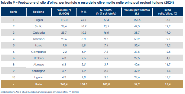 Completano il podio tricolore la Sicilia (10,7%) e la Calabria (10,3%); seguono Toscana (8,3%) e Lazio (6,8%). Pugliese anche il primato della produzione unitaria: 155,6 tonnellate per frantoio, a fronte di 55,4 tonnellate del Lazio, 50,9 della Toscana e 47,5 della Sicilia; la Calabria si ferma a 38,7 tonnellate (59,9 tonnellate la media nazionale).