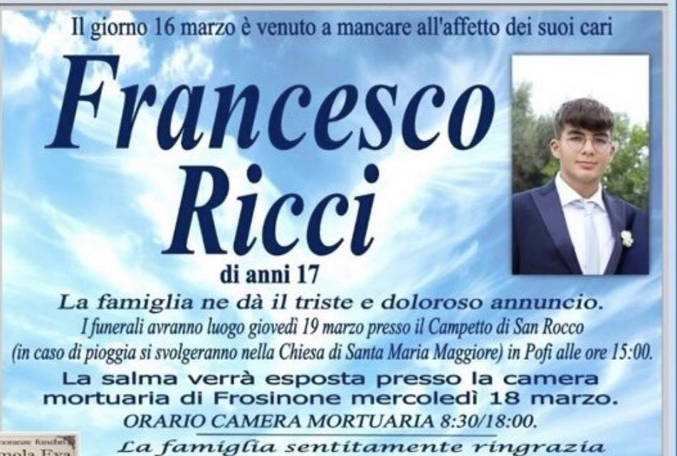 Domani l’intera comunità si stringe per l’ultimo saluto al diciassettenne i cui funerali si terranno al campetto di san Rocco a Pofi alle 15.