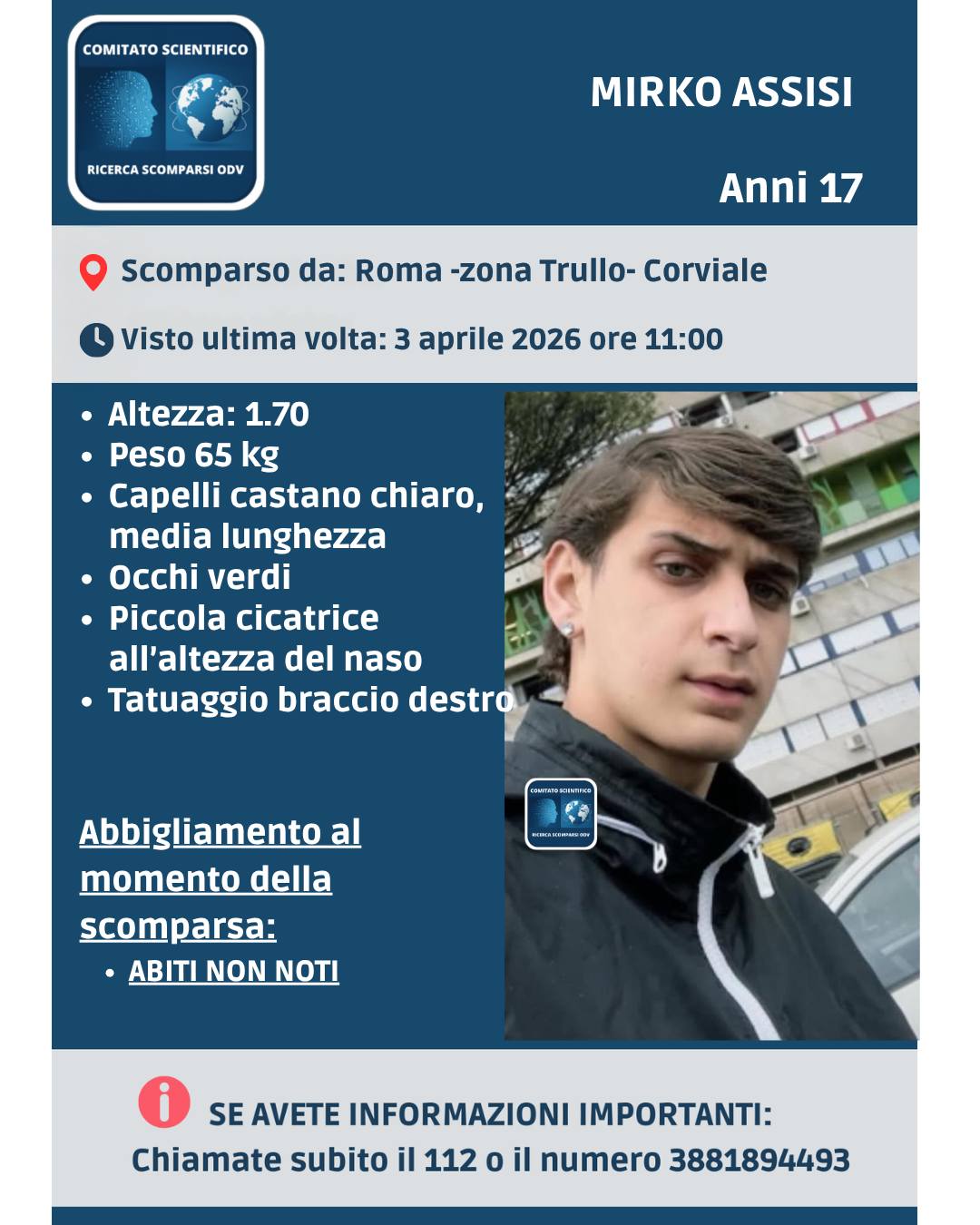 ROMA – Giorni di crescente preoccupazione per Mirko Assisi, diciassettenne scomparso da Roma lo scorso 3 aprile.