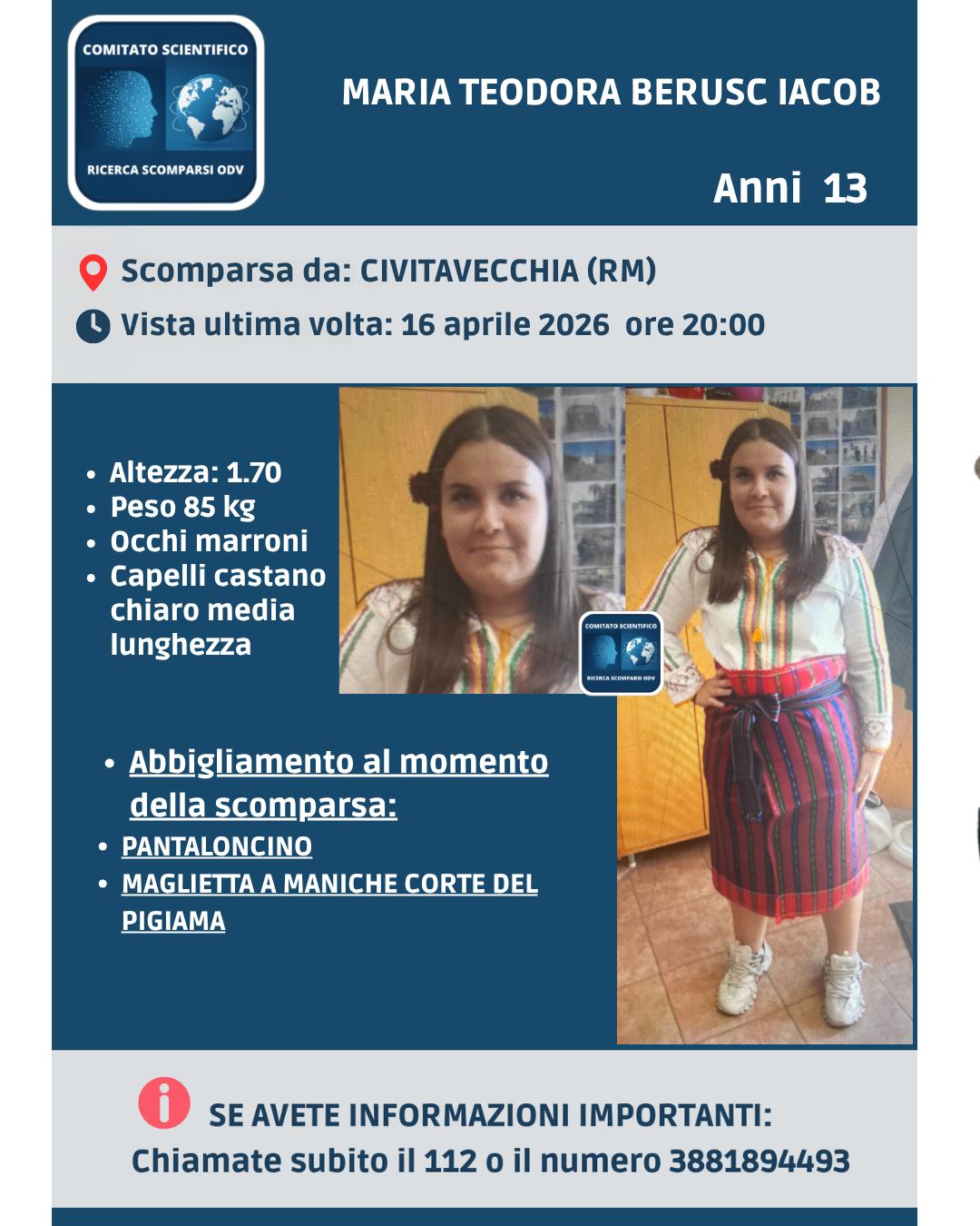 “Maria Teodora si è allontanata dalla sua abitazione di Civitavecchia il 16 aprile 2026 verso le 20:00, indossava la maglia del pigiama e dei pantaloncini. Se qualcuno l’ha notata o la vede è pregato di contattare il 112 o il nostro numero: 388 189 4493”.
