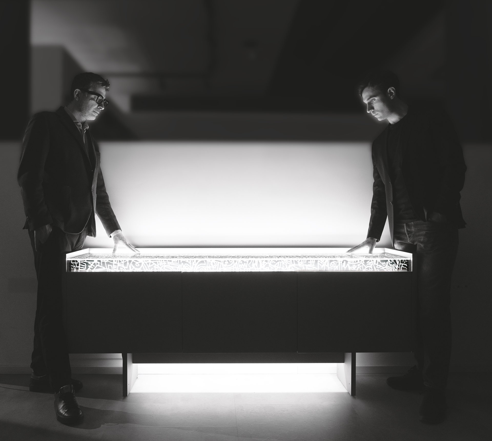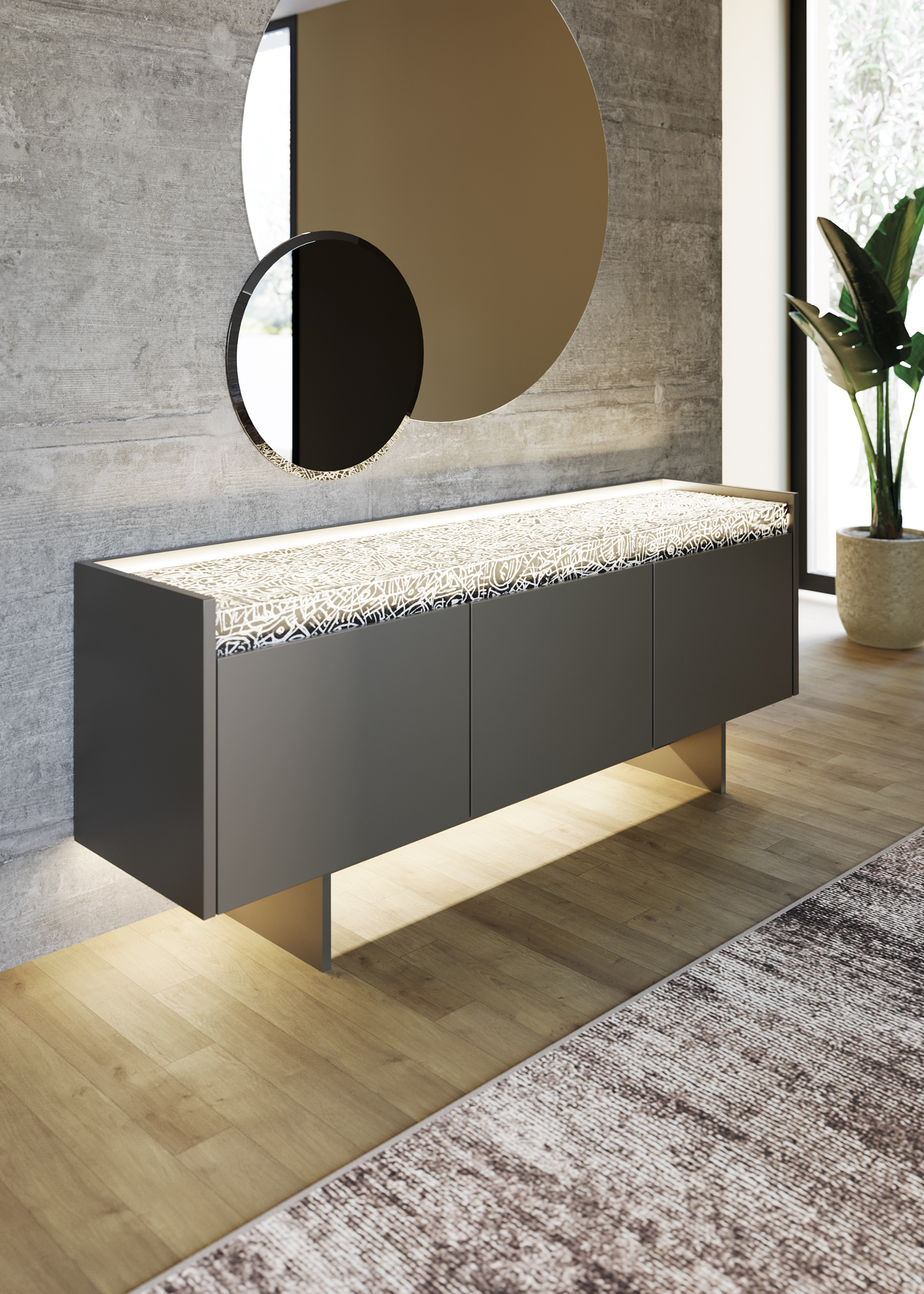 Arte e Design: Il vero elemento distintivo è il piano superiore. Realizzato in vetro retroilluminato, è impreziosito da una serigrafia originale dell’artista Paolo Pelliccia. Questo dettaglio trasforma una superficie funzionale in un elemento vivo e dinamico, che reagisce alla luce restituendo atmosfere sempre nuove e mutevoli.